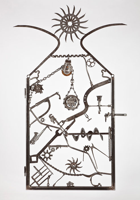 The iron gates showcased on bottles of Heaven’s Door Whiskey, were created by Bob Dylan at his metalworking shop, Black Buffalo Ironworks, and are comprised of found objects collected from farms and scrap yards across America. "Everything from farm equipment, kitchen utensils, and antique firearms to chains, axes and wheels."